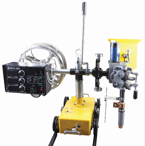 黥器和焊槍調(diào)整機構。焊接電源、筒體轉(zhuǎn)胎和焊絲盤為常規(guī)設備。其創(chuàng)新之處在于:一是焊接小車體積小、,