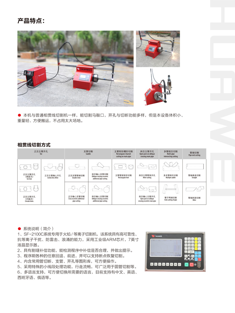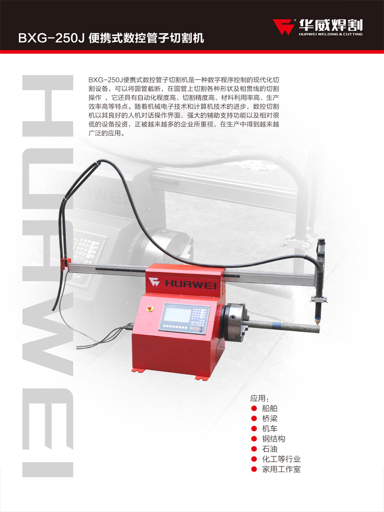 BXG-250J便攜式數(shù)控管子切割機是一種數(shù)字程序控制的現(xiàn)代化切割設(shè)備,可以將圓管截斷,在圓管上切割各種形狀及相貫線的切割操作 ,它還具有自動化程度高、切割精度高、材料利用率高、生產(chǎn)效率高等特點。隨著機械電子技術(shù)和計算機技術(shù)的進步,數(shù)控切割機以其良好的人機對話操作界面、強大的輔助支持功能以及相對很低的設(shè)備投資,正被越來越多的企業(yè)所重視,在生產(chǎn)中得到越來越廣泛的應(yīng)用
