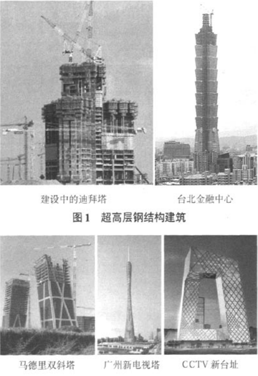 超高層建筑是人類征服自然,不斷取得進(jìn)步的重要標(biāo)志,是現(xiàn)代科學(xué)技術(shù)發(fā)展的結(jié)晶,也是一個(gè)國(guó)家科技發(fā)展水平和綜合實(shí)力的集中體現(xiàn)之一。因此無(wú)論是發(fā)達(dá)國(guó)家,還是發(fā)展中國(guó)家都把興建超高層建筑作為展示社會(huì)發(fā)展成就的重要手段。而超高層建筑通常采用鋼結(jié)構(gòu)作為主要構(gòu)成部分,因此超高層建筑一般都是超高層鋼結(jié)構(gòu)?,F(xiàn)代超高層建筑起源于美國(guó),已有110年的發(fā)展歷史,超高層建筑的興建不但具有顯著的經(jīng)濟(jì)效益和社會(huì)效益,能夠展現(xiàn)一個(gè)時(shí)代、~個(gè)國(guó)家的科技發(fā)展成就,而且可以極大地促進(jìn)相關(guān)領(lǐng)域科技的發(fā)展。因此目前興起了超高層建筑建設(shè)的新高潮。不僅高度越來(lái)越高,如高達(dá)492m的上海環(huán)球金融中心,508m的臺(tái)北國(guó)際金融中心,阿聯(lián)酋超過(guò)700m高的Burj Dubai大廈(迪拜塔),圖l。而且超高層建筑造型也更加多樣化,扭轉(zhuǎn)的廣州新電視塔和傾斜的中央電視臺(tái)新臺(tái)址建設(shè)工程就是其中典型的代表。