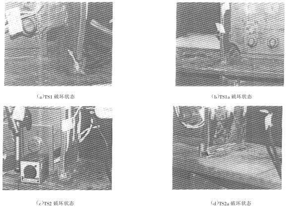 試驗時,首先沿使梁的上翼緣受拉的方向施加水平荷載, 然后反復(fù)加載。試件 TSl 由于平面外約束不足,在彈性加載階段就出現(xiàn)了扭轉(zhuǎn), 節(jié)點板域有輕微屈服發(fā)生。塑性階段,焊接孔末端梁腹板與翼緣相接處上翼緣被腹板抵壓開裂。剪切板出現(xiàn)滑移, 破壞時下翼緣幾乎全部裂開, 加載點平面外位移約 5cm。TSla 在塑性階段,腹板受壓側(cè)觀察到局部屈曲,梁端加載點平面外位移最大達7cm, 剪切板附加焊縫受拉側(cè)明顯開裂。最后受拉側(cè)翼緣焊縫突然破壞, 荷載迅速下降, 梁下翼緣部分拉斷,同時上翼緣被壓屈。