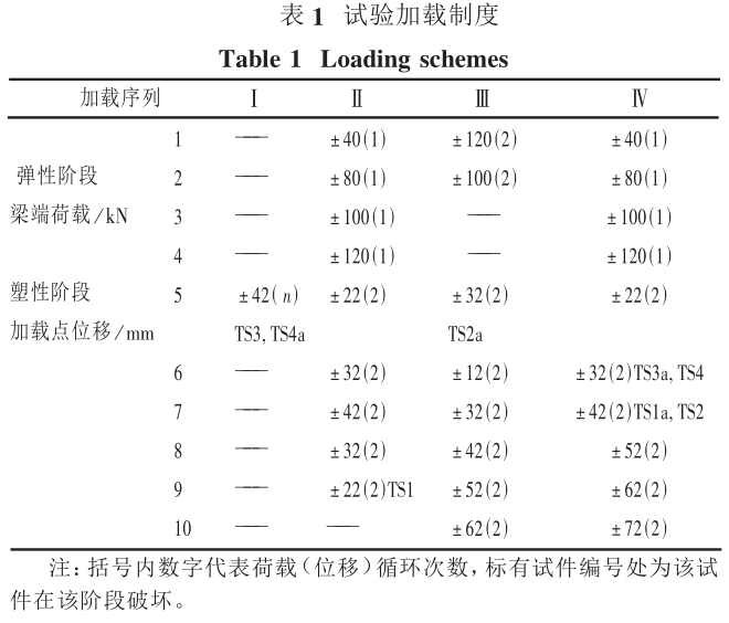 根據(jù)有限元分析,試件的彈性極限荷載約為120kN。加載分兩個階段,彈性階段最大荷載為120kN, 采用荷載增量控制, 出現(xiàn)塑性屈服后采用位移增量控制。為了研究加載次序?qū)υ嚰休d性能的影響, 試驗過程中采用了 4 種不同加載序列 (表 1 ) 。 其中加載序列 I 為直接在 42mm 位移幅度下加載至試件破壞。 試件 TS3 和 TS4a 采用加載序列 I, TS1 采用加載序列 II, TS2a 采用加載序列 III, TS1a、 TS2、 TS3a 和 TS4采用加載序列 IV。實際上在試驗中, 當梁端水平荷載加至 120kN 時已經(jīng)觀察到局部漆皮起皺,即已發(fā)生局部的材料屈服。