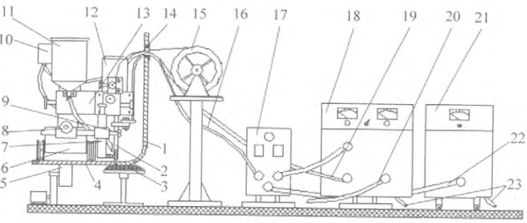 (3)將焊絲盤15及其支架靠近封頭中心外側(cè)安放。焊接電源18、轉(zhuǎn)胎5和電控箱17分別通過動(dòng)力線23接人供電電源,并按焊接要求互相連接。再將電控線16、焊絲和焊接把線19一并從封頭中心孔進(jìn)入筒內(nèi),將它們與焊接小車的相關(guān)部分連接。
