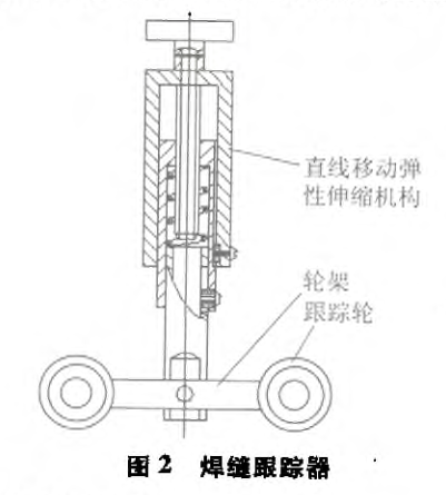 焊縫跟蹤器是保證焊接質(zhì)量的關(guān)鍵部件,依靠它為焊接小車行走強(qiáng)制導(dǎo)向,從而保證焊槍2始終不偏離焊縫。它由兩個(gè)導(dǎo)向輪、一個(gè)輪架、一套直線移動(dòng)彈性伸縮機(jī)構(gòu)組成,結(jié)構(gòu)如圖2所示。焊縫跟蹤器7通過豎直調(diào)整夾具9與安裝在焊接小車前端的水平調(diào)整裝置8相連。工作時(shí)焊縫跟蹤器的兩個(gè)跟蹤輪騎在焊縫中,依靠焊縫為其導(dǎo)向,并在彈性壓力下,兩輪始終沿焊縫滾動(dòng),通過機(jī)械強(qiáng)制力使焊接小車跟隨其始終與焊縫保持等距行走。