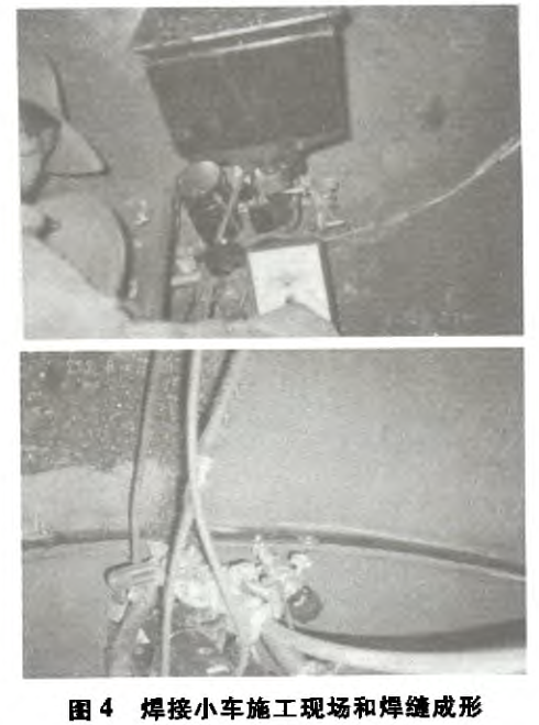 (4)焊接過程中,焊縫跟蹤器7將始終為焊接小車導(dǎo)向。在焊接臨近頭尾相接時(shí)。跟蹤輪將失去焊縫依托,但靠原已形成的導(dǎo)向作用延續(xù),焊接小車仍會(huì)沿焊接反向繼續(xù)前進(jìn)直至與焊接起點(diǎn)重合。完成焊縫對(duì)接后,按下焊接操作盒10上的“停止焊接”按鈕,內(nèi)環(huán)縫焊接結(jié)束。焊接小車施工現(xiàn)場和焊縫成形如圖4所示