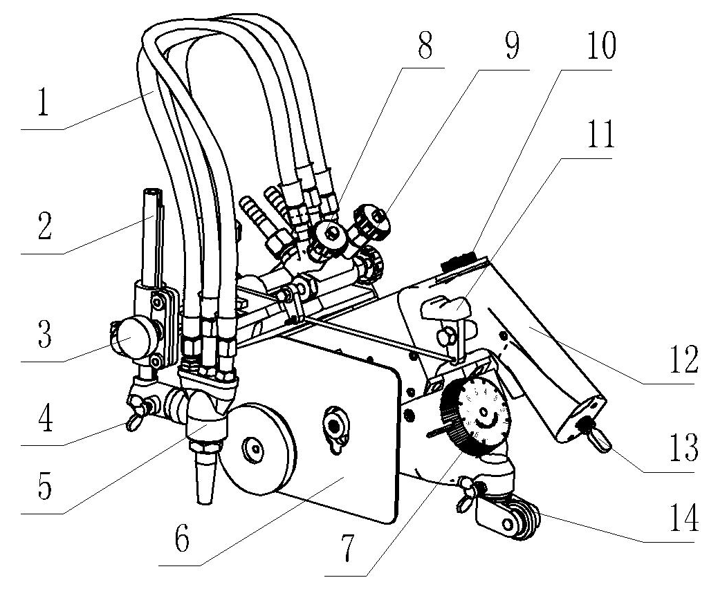 旋轉(zhuǎn)手輪,可調(diào)節(jié)割炬與鋼板之間的垂直距離。 |