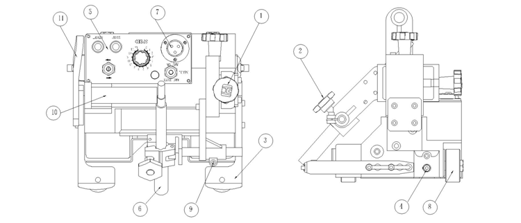 1. 焊炬調(diào)整滑塊:起弧點可以利用此裝置進行上/下、前/后的調(diào)整,行程各有45mm。