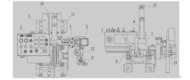 HK-100S由小車本體、控制箱,X-Y滑塊,焊槍夾具,導(dǎo)向輪,直線導(dǎo)軌等部件組成。