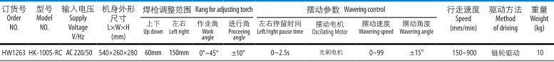 該機(jī)具有擺動功能,有不同規(guī)格的焊道方式可供選擇,以獲得最佳的焊接效果。擺動速度,擺動角度,中心偏移位置和左右停留時間均可方便的調(diào)整,數(shù)碼管顯示各種調(diào)整數(shù)據(jù)。較寬的軌道讓整臺機(jī)器的重心更穩(wěn)定,軌道下裝有帶開關(guān)的永磁磁鐵,安裝移動更方便。驅(qū)動部分安裝了手動離合裝置,方便機(jī)器在軌道上快速定位,導(dǎo)輪也配有離合裝置,可以很方便的進(jìn)行小車與導(dǎo)軌之間安裝與拆卸??梢赃M(jìn)行垂直角焊和水平角焊,適用于加強(qiáng)件等的交叉部位的焊接。焊接不銹鋼或鋁材,可選用真空吸盤導(dǎo)軌。無線遙控操作更加省心省力,注:標(biāo)配二根長度為2米的柔性導(dǎo)軌。