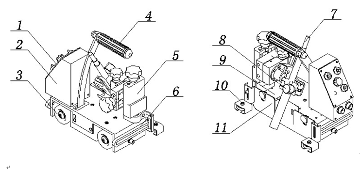 9. 底座 10.導向輪:沿著母材面滾動,引導準確焊接部位的裝置。 |