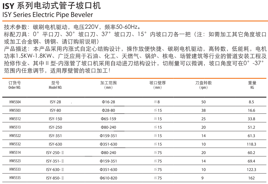 ISY系列內(nèi)漲式電動(dòng)管子坡口機(jī)是本公司研制的輕便型的鋼管坡口加工機(jī)具。該系列坡口機(jī)專為內(nèi)徑為Φ28~Φ360mm的鋼管倒角而設(shè)計(jì)。本系列鋼管坡口機(jī),采用交流220V電機(jī)作為動(dòng)力,內(nèi)漲式結(jié)構(gòu),自鋼管中心,操作方便。全新的設(shè)計(jì)理念和造型、卓越的使用性能,使其處于國內(nèi)坡口加工技術(shù)的領(lǐng)先地位。本機(jī)可對(duì)鋼管進(jìn)行坡口、平面法蘭加工。無論管壁厚薄,其加工性能與效率比起傳統(tǒng)工藝都有著不可替代的優(yōu)勢(shì)。