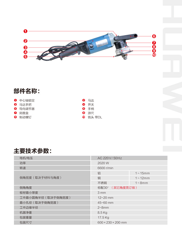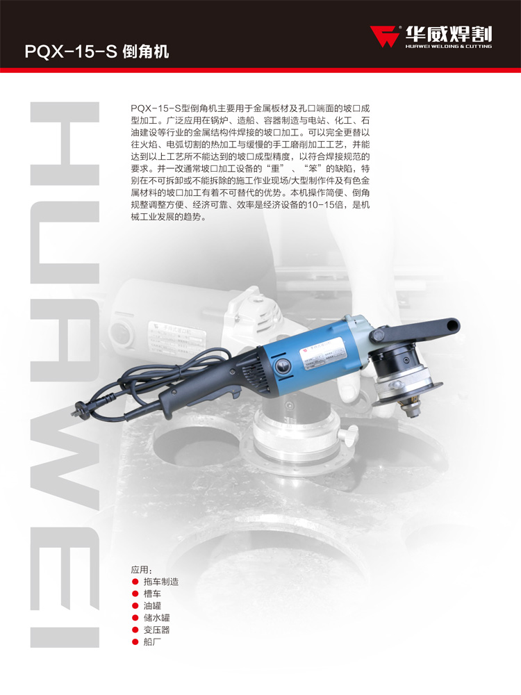 PQX-15-S型倒角機主要用于金屬板材及孔口端面的坡口成型加工。廣泛應用在鍋爐、造船、容器制造與電站、化工、石油建設(shè)等行業(yè)的金屬結(jié)構(gòu)件焊接的坡口加工??梢酝耆嬉酝鹧?、電弧切割的熱加工與緩慢的手工磨削加工工藝,并能達到以上工藝所不能達到的坡口成型精度,以符合焊接規(guī)范的要求。并一改通常坡口加工設(shè)備的“重” 、“笨”的缺陷,特別在不可拆卸或不能拆除的施工作業(yè)現(xiàn)場/大型制作件及有色金屬材料的坡口加工有著不可替代的優(yōu)勢。本機操作簡便、倒角規(guī)整調(diào)整方便、經(jīng)濟可靠、效率是經(jīng)濟設(shè)備的10-15倍,是機械工業(yè)發(fā)展的趨勢