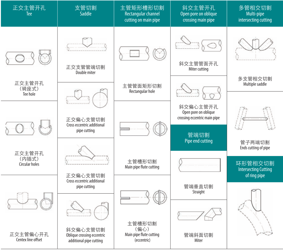 本機是一種對鋼管端部結合處作自動計算和切斷的設備。該機器能廣泛應用于建筑、化工、機械、冶金等行業(yè)的管道結構件的切割加工。這些行業(yè)中有大量的管道結和相貫線孔、相貫線端頭,,此類加工大多采用制作樣板、劃線、人工放樣、手工切割、人工打磨等落后又繁復的方法來進行。而本機能十分方便的切割此類工件,并且操作人員不需計算與手工編程、只需輸入相互配合的管子的半徑、相交角度等參數(shù),機器就能自動切割出管子的相貫線、相貫孔。